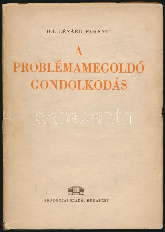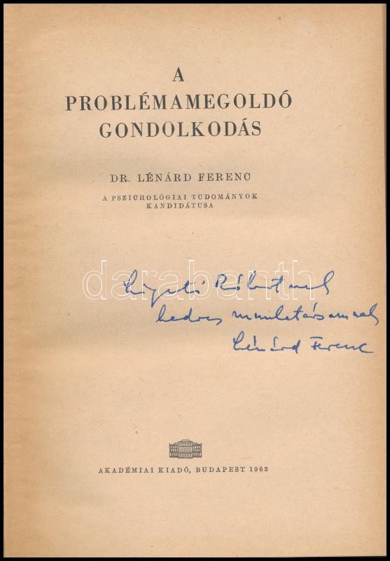 Dr. Lénárd Ferenc: A problémamegoldó gondolkodás. Bp.,1963, Akadémiai Kiadó. Kiadói egészvászon-kötés, kiadói papír védőborítóban. Megjelent 1200 példányban. A szerző által dedikált.
