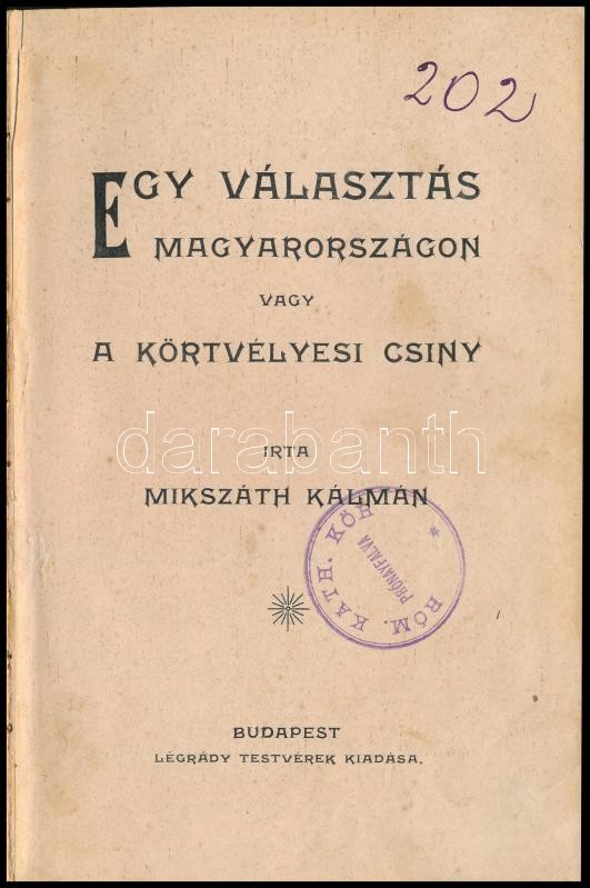 Mikszáth Kámán:Egy választás Magyarországon vagy a körtvélyesi csiny. ... https://www.darabanth.com/de/356-Fernauktion/356.0/Bucher/Bucher-Andere-kuriositaten~1000020/Mikszath-KamanEgy-valasztas-Magyarorszagon-vagy-a-kortvelyesi-csiny-Bp-en-Legrady-~II2040488