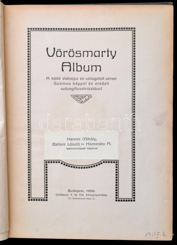 Vörösmarty Album. Műmellékletek nélküli, népszerű kiadás. Bp.,1909, Wodianer F. és Fiai, 240 p.+ 5 t. A lapok tetején szecessziós könyvillusztrációkkal. Nemes Mihály, Belloni László, és Homicsko A. egészoldalas illusztrációival. Kiadói aranyozott egészvászon-kötés, Gottermayer-kötés, kopott borítóval, hiányzó hátsó szennylappal.