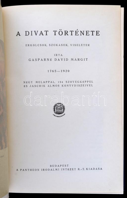 Gáspárné Dávid Margit: A divat története. Erkölcsök, szokások, viseletek. 1765-1920. Bp.,1923,Pantheon, 254 p. Gazdag fekete-fehér szövegközti és egészoldalas illusztrációkkal. Jaschik Álmos könyvdíszeivel. Kiadói aranyozott egészvászon-kötésben, jó állapotban.