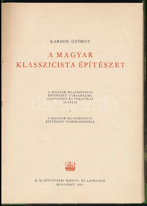 Kardos György: A magyar klasszicista építészet. A magyar klasszicista építészet társadalmi, gazdasági és politikai alapjai. A magyar klasszicista építészet formaképzése. Mérnöki Továbbképző Kiadványok. Építőművészet Kérdései. Bp., 1953, Magyar Építőművészek Szövetsége-É. M. Építőipari Könyv- és Lapkiadó, 89 p. Átkötött félvászon-kötés, volt könyvtári példány.