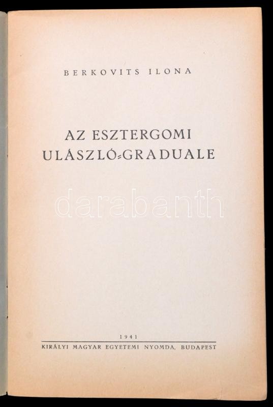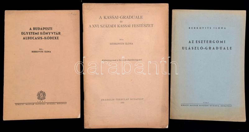 3 történelmi munka: Berkovits Ilona: Az esztergomi Ulászló graduale + Berkovits Ilona: A budapesti Egyetemi könyvtár Albucasis-Kódexe Bp., 1937, 1938, Kir. Magyar Egyetemi Nyomda. + Berkovits Ilona: A kassai-graduale és a XVI. századi kassai festészet. Bp., 1942. Franklin. Kiadói papírkötésben,