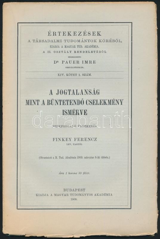 Finkey Ferenc: A jogtalanság, mint a büntetendő cselekmény ismérve. Értekezések a társadalmi tudományok köréből. XIV. köt. 1. sz. Bp., 1909, MTA. Kiadói papírkötés.