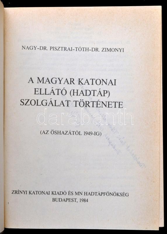 Nagy Sándor-Dr. Pisztrai László-Tóth József-Dr. Zimonyi István: A magyar katonai ellátó (hadtáp) szolgálat történet. (Az őshazától 1949-ig.) Bp., 1984, Zrínyi, 631 p. Szövegközti fekete-fehér fotókkal. Kiadói nylon-kötés, kiadói szakadt papír védőborítóban. Megjelent 1000 példányban.