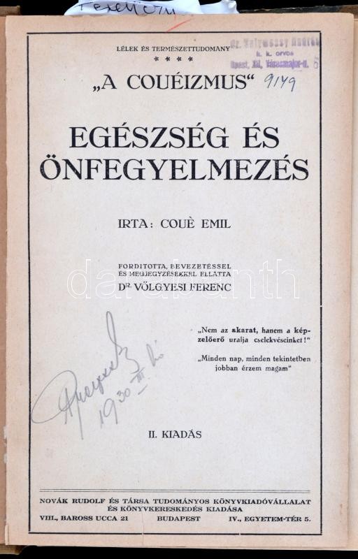 Vegyes könyvtétel, 3 db: Thanhoffer Lajos: Anatómia és divat Három népszerű előadás. Bp., 1901. K. M. Természettudományi Társulat, VIII+232 p.+4 t. Egészoldalas és szövegközti képekkel gazdagon illusztrálva. Kiadói egészvászon kötésben, Frankl és Werner-kötés, kissé kopott borítóval, az elülső szennylapon ceruzás jegyzettel, hátul beragasztott cikkel. jó állapotban. Coué Emil: "A couéizmus." Egészség és önfejlesztés. Ford. bevezetéssel és megjegyzésekkel ellátta: Dr. Völgyesi Ferenc. Lélek és Természettudomány. Bp.,é.n., Novák Rudolf.+Dr. Ferenczi Sándor: Ideges tünetek keletkezése és eltűnése és egyéb értekezések a pszichoanalízis köréből. Bp.,1914, Dick Manó. [Egybekötve.] Átkötött félvászon-kötés, kopott borítóval, az első részből kijáró lapokkal, laza fűzéssel. Dr. Röhmann F.: Vezérfonal a khémiai gyakorlatokban orvostanhallgatók számára. Ford.: Huber Alfréd. Bp.,1891, Franklin. Három táblával, az egyik színes. Átkötött félvászon-kötésben, kopott borítóval, sérült gerinccel, ceruzás aláhúzásokkal.
