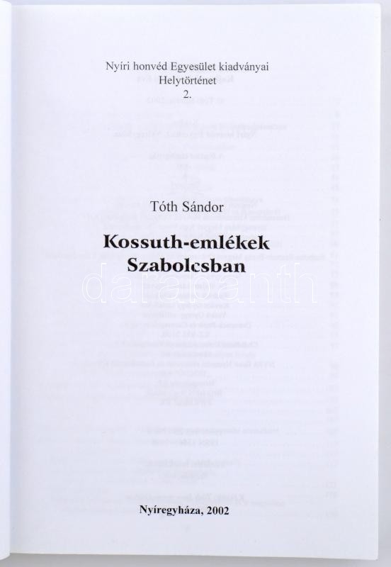 Tóth Sándor: Kossuth-emlékek Szabolcsban. Nyíri Honvéd Egyesület kiadványai Helytörténet2. Nyíregyháza, 2002, Nyíri Honvéd Egyesület. Kiadói papírkötés. Megjelent 1000 példányban. A szerző által dedikált.