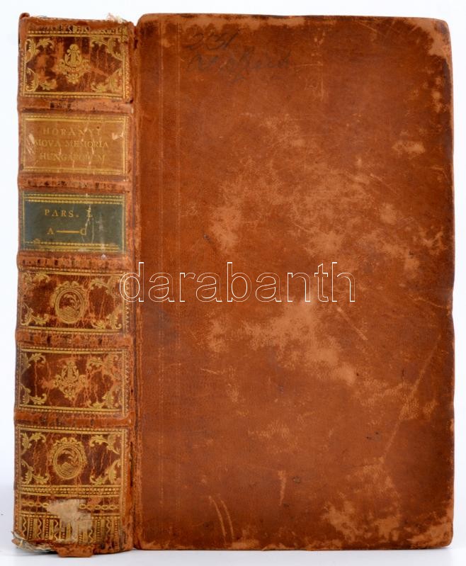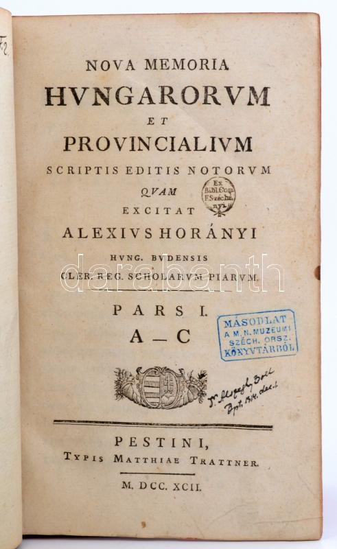 Horányi Elek: Nova memoria Hungarorum et provincialium scriptis editis notorum. 1. köt. Pest, 1792, Trattner. Alszeghy Zsolt irodalomtörténész névbejegyzésével, ex libris-ével. Kicsit sérült bőrkötésben, egyébként jó állapotban.