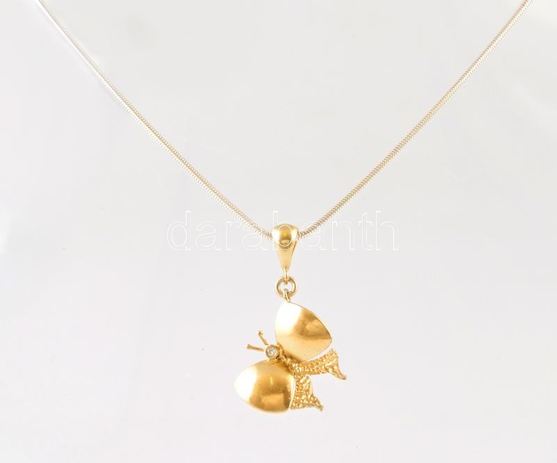 Beschreibung: Ezüst(Ag) kígyó nyaklánc, köves aranyozott lepke függővel, jelzett, h: 41 cm, 3×1,8 cm, bruttó: 5,7 g