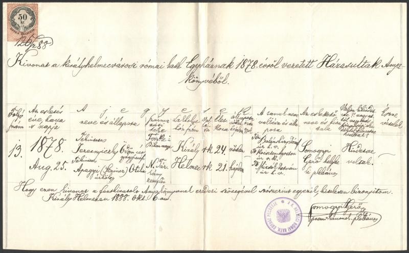 1888 Királyhelmec anyakönyvi kivonat https://www.darabanth.com/de/356-Fernauktion/356.0/Kunst-Dokumente-andere-Sammelgebiete/Dokument~500017/1888-Kiralyhelmec-anyakonyvi-kivonat~II2038612
