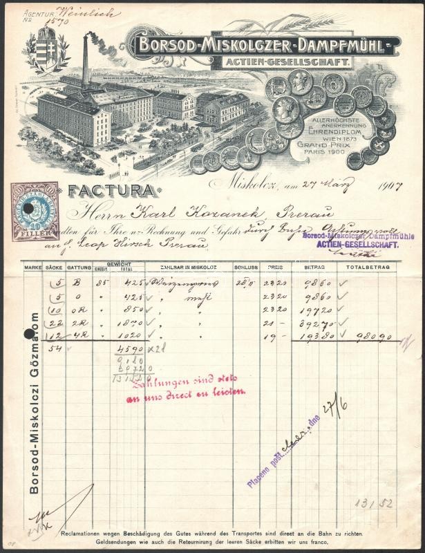 1907 Borsod-Miskolci gőzmalom fejléces számla https://www.darabanth.com/de/356-Fernauktion/356.0/Kunst-Dokumente-andere-Sammelgebiete/Drucksachen~500029/1907-Borsod-Miskolci-gozmalom-fejleces-szamla~II2038763