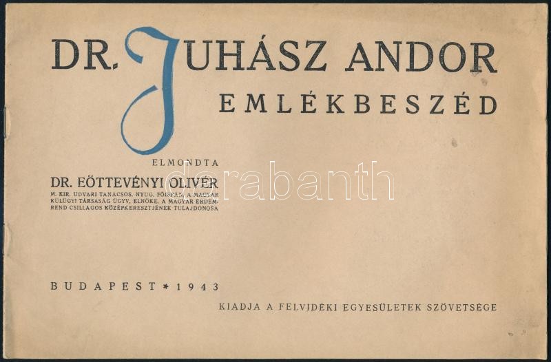 1943 Dr. Juhász Andor emlékbeszéd, elmondta: Eöttevényi Olivér, Bp., F... https://www.darabanth.com/de/356-Fernauktion/356.0/Kunst-Dokumente-andere-Sammelgebiete/Drucksachen~500029/1943-Dr-Juhasz-Andor-emlekbeszed-elmondta-Eottevenyi-Oliver-Bp-Felvideki-Egyesuletek-S~II2040209