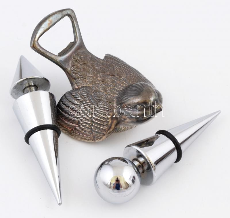 Beschreibung: Fém palackzáró dugók ( 2db), h: 9 cm ( 2×), madaras sörnyitó, 6×8 cm