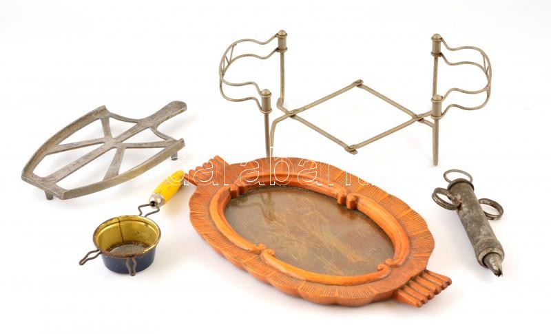 Beschreibung: Vegyes bolha tétel: fém edény, vasalótartó, kinyomó, konyhai szűrő, tálca, összesen 5 db
