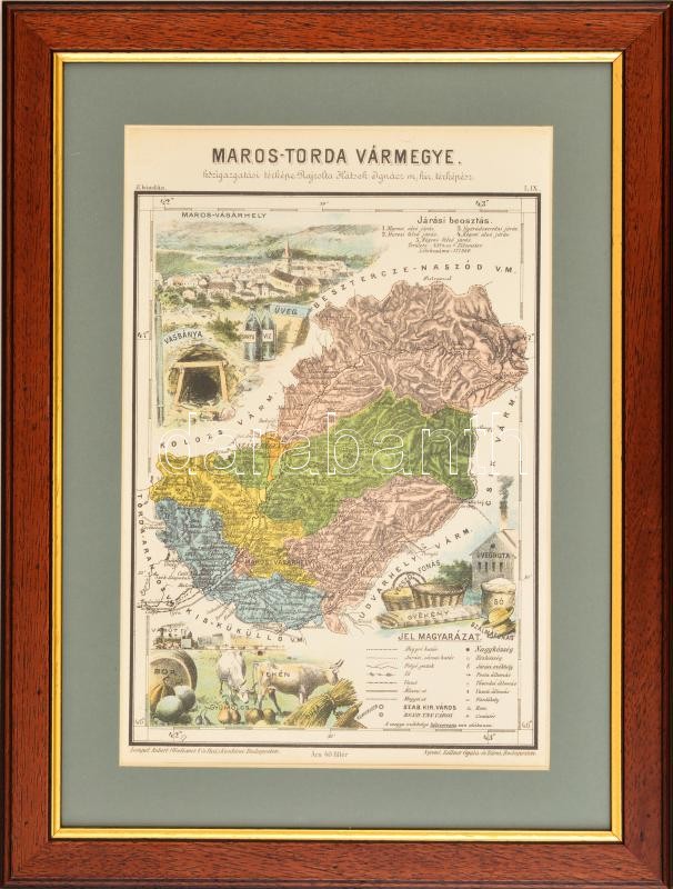 Beschreibung: Maros-Torda vármegye közigazgatási térképe (Marosvásárhely), színezett fametszet, paszpartuban, plexizett fa keretben, 34,5×23 cm