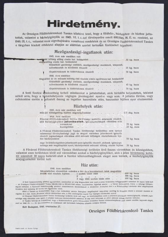 Beschreibung: 1946 Országos Földbirtokrendező Tanács hirdetménye a földosztásról, 1946. szept. 27., hajtásnyomokkal, szakadt, 59x42 cm