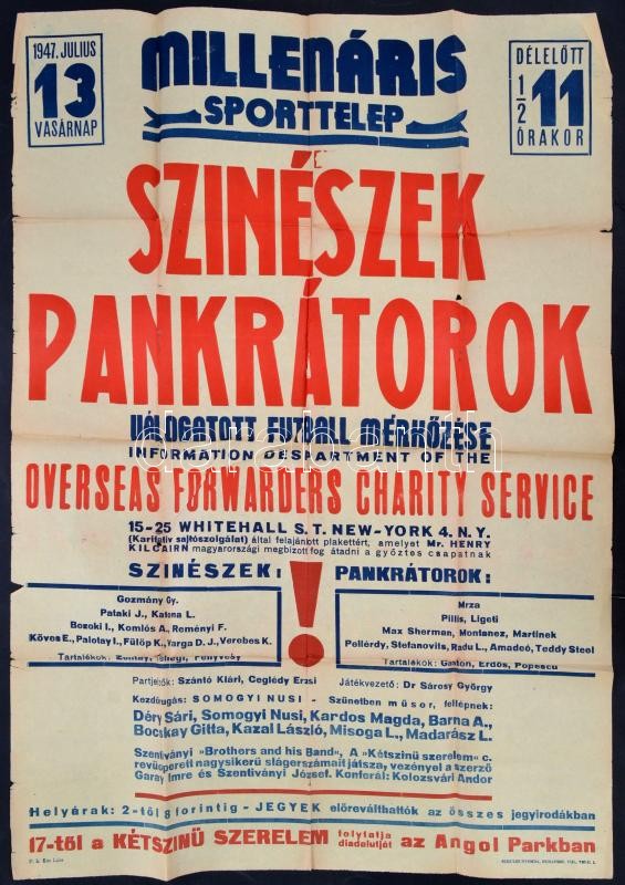 1947 Színészek, pankrátorok futballmérkőzése, plakát, sérülésekkel, ha... https://www.darabanth.com/de/356-Fernauktion/356.0/Kunst-Dokumente-andere-Sammelgebiete/Plakat~500031/1947-Szineszek-pankratorok-futballmerkozese-plakat-serulesekkel-hajtott-84C39759-cm~II2041047