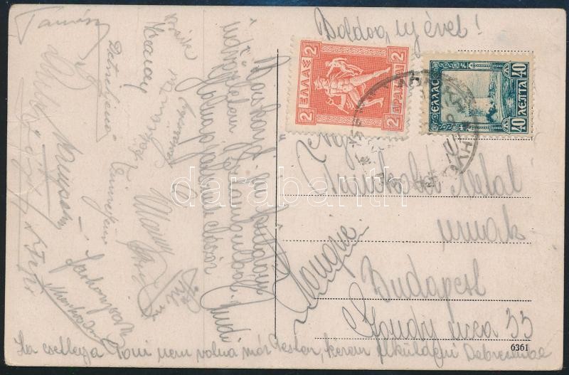 Beschreibung: 1927 A debreceni Bocskai FC labdarúgóinak (Vincze, Markas, Baik, stb.) aláírásai Görögországból küldött levelezőlapon