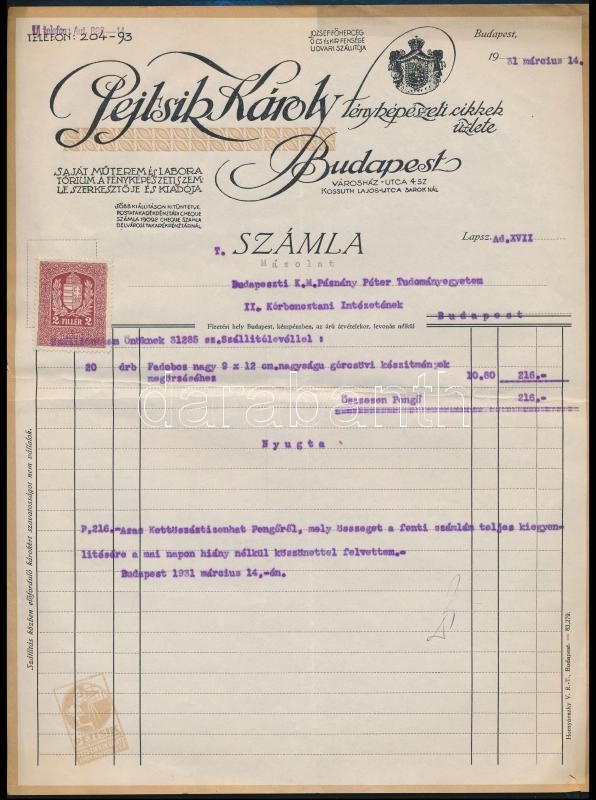1931-1933 Pázmány Péter Tudomány Egyetem II. sz. Kórbonctani Intézetének szóló 2 fejléces számla (Pejtsik Károl fényképészeti cikkek üzlete, Nagy Károly Frigyes Orvosi Műszerek és Betegápolási Cikkek Gyára), és 1 fejléces levelezőlap (Szent István-Társulat, Novák Rudolf és Társa (az utóbbi tanársegéd részére címezve.)