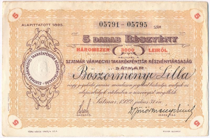 Romania / Satu-Mare (Szatmár) 1922. "Szatmár Vármegyei Takarépénztár Részvénytársaság" share with the shareholders name, five shares in one in sum total of 3000 Lei with coupons C:XF,VF