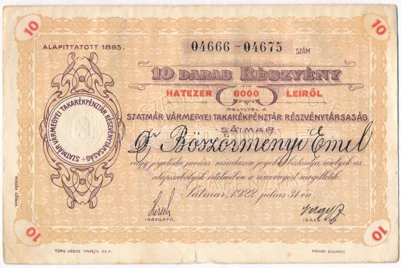 Románia / Satu-Mare (Szatmár) 1922. "Szatmár Vármegyei Takarépénztár Részvénytársaság" névre szóló 10db részvénye egyben, összesen 6000L-ről szelvényekkel, szárazpecséttel T:II,II- / Romania / Satu-Mare (Szatmár) 1922. "Szatmár Vármegyei Takarépénztár Részvénytársaság" share with the shareholders name, ten shares in one in sum total of 6000 Lei with coupons C:XF,VF