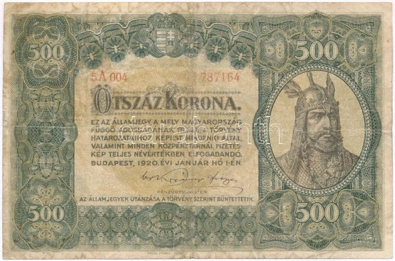 1920. 500K "Orell Füssli Zürich" "5A004 787164" T:... https://www.darabanth.com/de/356-Fernauktion/356.0/Numismatik/Ungarische-Banknoten~2500008/1920-500K-Orell-Fussli-Zurich-5A004-787164-TIII--Hungary-1920-500-Korona-Orell-Fussli-ZC3~II2041575