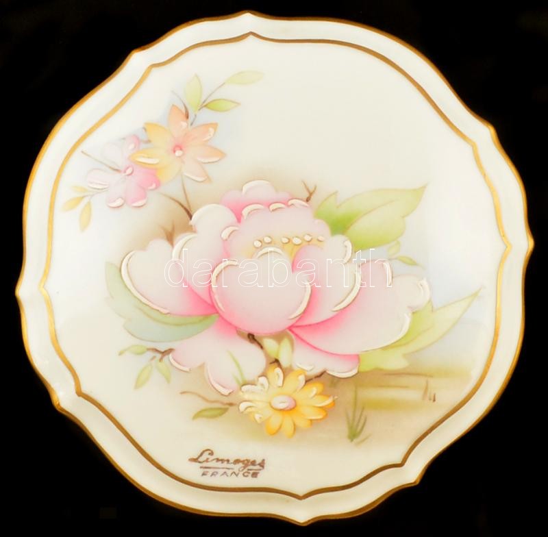 Beschreibung: Limoges bonbonier, részben kézzel festett, jelzett, apró kopásnyomokkal, d:14 cm