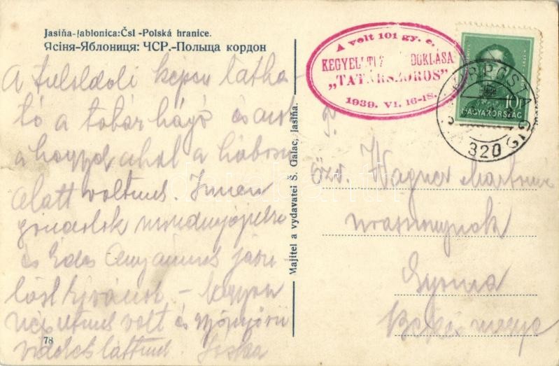 Kőrösmező, Jaszinya, Jasina-Jablonica, Yasinia (Máramaros); lengyel határ / Polska hranice / Polish border + "A volt 101. gy.e. kegyeleti zarándoklása "Tatárszoros" 1939 VI. 16-18." + M. Kir. Posta 320" (EK)