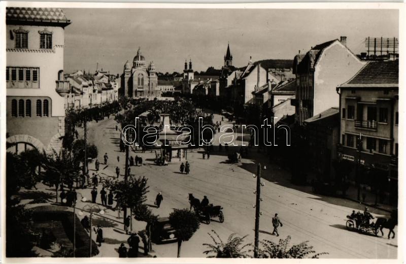Beschreibung: Marosvásárhely, Targu Mures; Széchenyi tér, automobil, lovaskocsi, üzletek / square, automobile, horse-drawn carriage, shops
