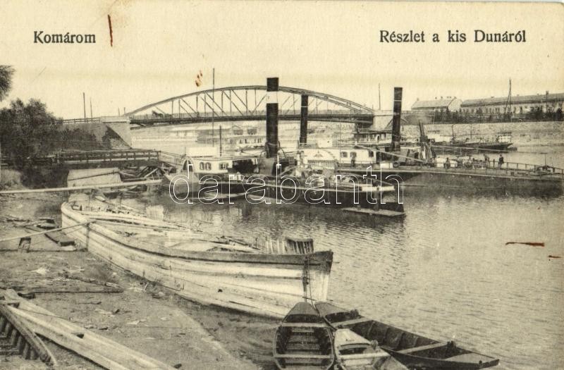 Komárom, Komárnó; Kis Duna és kikötő, Wekerle Sándor oldalkerekes vontató gőzhajó a hajóműhelynél, háttérben a Dévény csavargőzös / port, Hungarian towing steamship