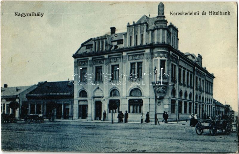 Beschreibung: Nagymihály, Michalovce; Kereskedelmi és Hitelbank. Kiadja Ifj. Grünfeld Mór / bank, loan bank, street (EK)