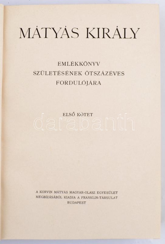 Mátyás Király emlékkönyv születésének ötszázéves évfordulójára I-II. Szerk.: Lukinich Imre. Bp., é.n. (1940), Franklin-Társulat, 574+1+522+2 p. Kiadói félbőrkötésben, szép állapotban.