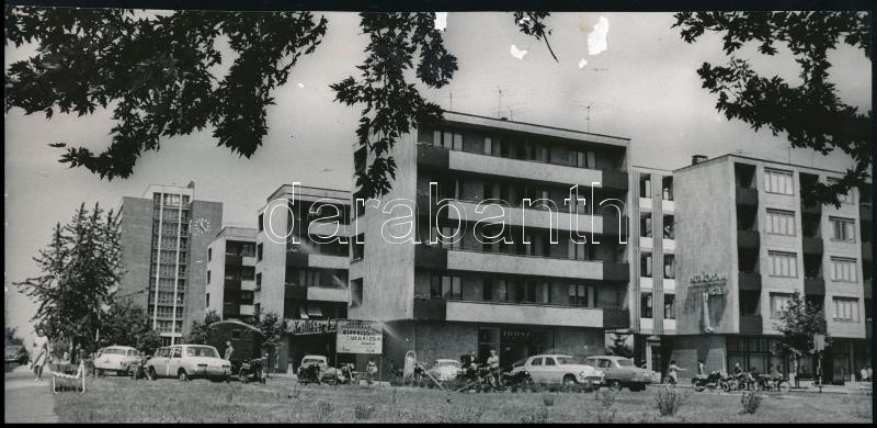Beschreibung: cca 1960-1970 Dunaújváros, Magyar Hírek Szerkesztősége, cukrászda, Ibusz iroda, Novotta Ferenc sajtófotója, sérült, 11×23 cm