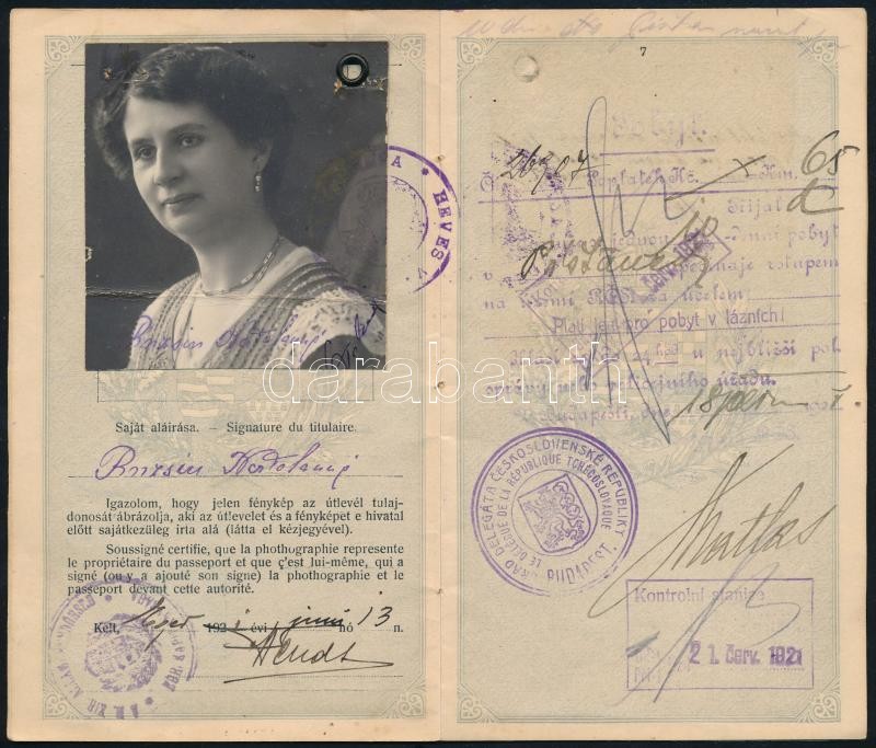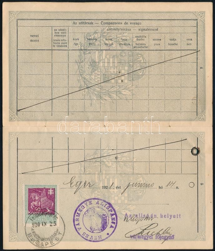 1920 A Magyar Királyság által kiadott útlevél, 2K bélyeg felülragasztva, 50K illetékkiegészítéssel felülbélyegezve, szép állapotban / Hungarian passport