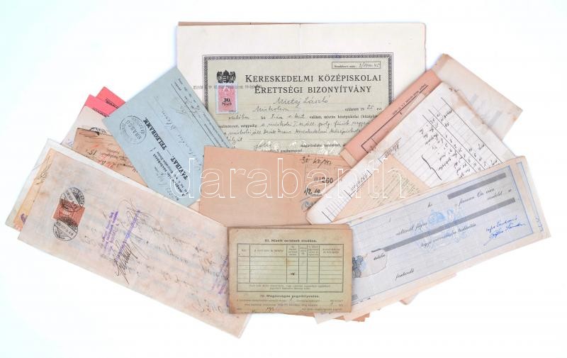 Beschreibung: Vegyes papírrégiség tétel: 29 db vegyes irat: váltók, feladóvevények, tértivevények, stb., közte illetékbélyegesek is
