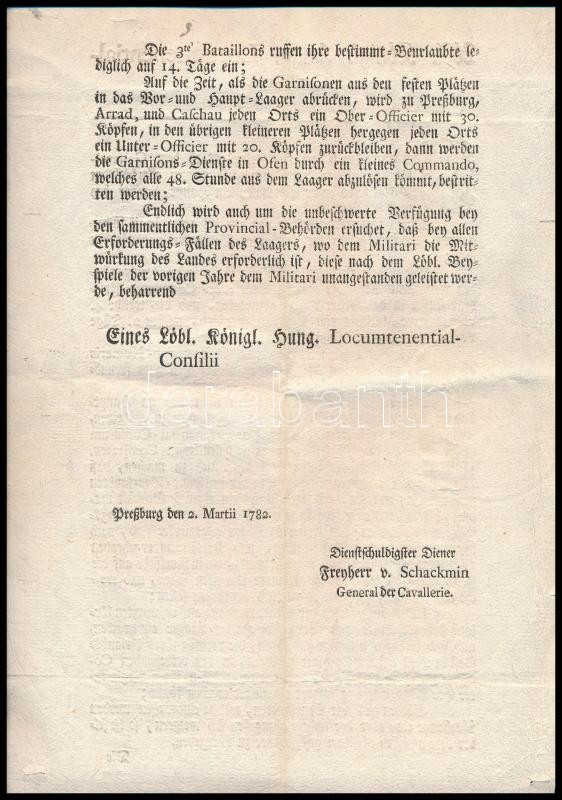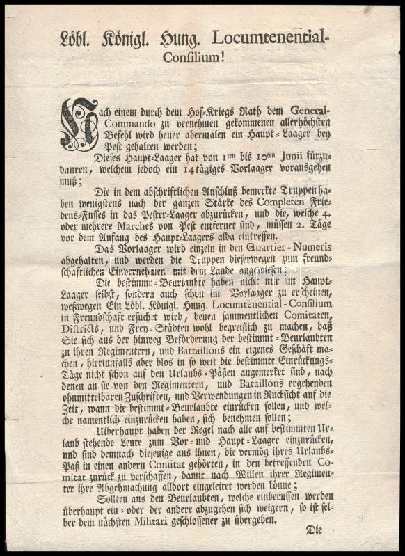 1782 Pesti katonai tábor létesítéséről szóló parancs https://www.darabanth.com/de/357-Fernauktion/357.0/Kunst-Dokumente-andere-Sammelgebiete/Militaria~500028/1782-Pesti-katonai-tabor-letesiteserol-szolo-parancs~II2053658