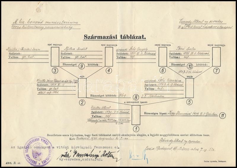 1940 Várady Albert, a m. kir. varasdi 10. honvéd huszárezred ny. ezredesének származási táblázata, Budapest Székesfőváros Vitézi Székkapitánya pecséttel, a budapesti széktartó aláírásával