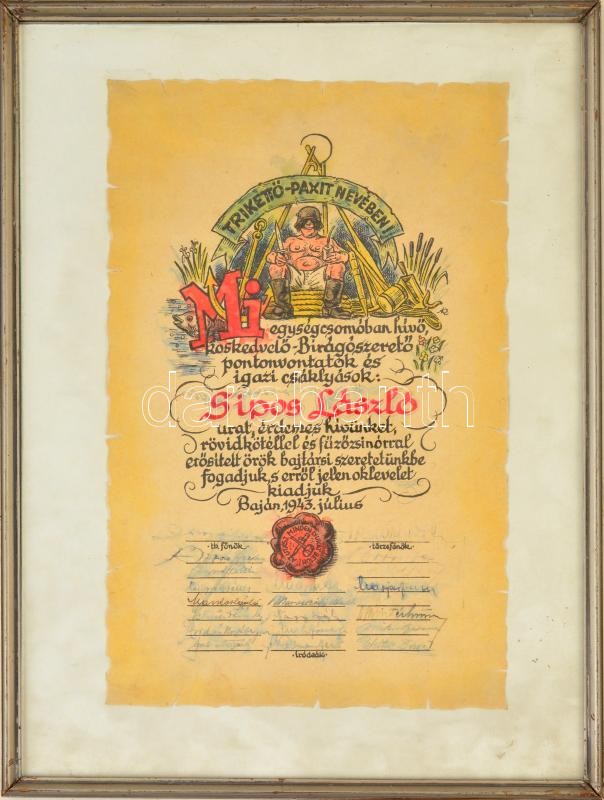 Beschreibung: 1943 Baja, "Trikettő-Paxit nevében", humoros-rajzos utász oklevél, szélein kis szakadással, üvegezett fa keretben
