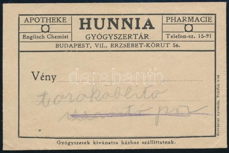 1930 Bp. VII. Erzsébet körút, Hunnia Gyógyszertár receptborítékja, szé... https://www.darabanth.com/de/357-Fernauktion/357.0/Kunst-Dokumente-andere-Sammelgebiete/Werbungen~500021/1930-Bp-VII-Erzsebet-korut-Hunnia-Gyogyszertar-receptboritekja-szep-allapotban~II2052102