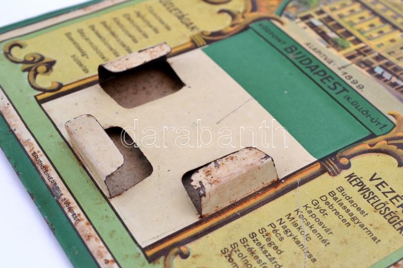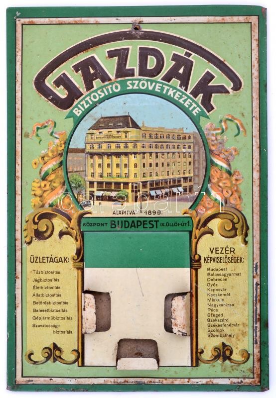 Gazdák Biztosító Szövetkezete lemez falinaptártartó, rozsdás, 23×15,5 ... https://www.darabanth.com/de/357-Fernauktion/357.0/Kunst-Dokumente-andere-Sammelgebiete/Werbungen~500021/Gazdak-Biztosito-Szovetkezete-lemez-falinaptartarto-rozsdas-23C39715-5-cm~II2018201