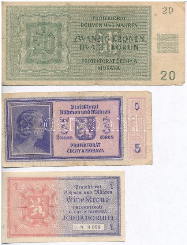 German Third Reich / Protectorate of Bohemia and Moravia 1940. 1 Koruna + 5 Korun + 50 Korun + 100 Korun + 1942. 10 Korun + 1944. 20 Korun C:F,VG
