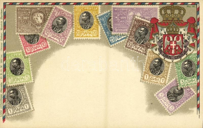 Stamps and coat of arms of Serbia. Carte Philatelique Ottmar Zieher No... https://www.darabanth.com/de/358-Fernauktion/358.0/Ansichtskarten/Briefmarken~1000056/Stamps-and-coat-of-arms-of-Serbia-Carte-Philatelique-Ottmar-Zieher-No-31-litho~II2060260