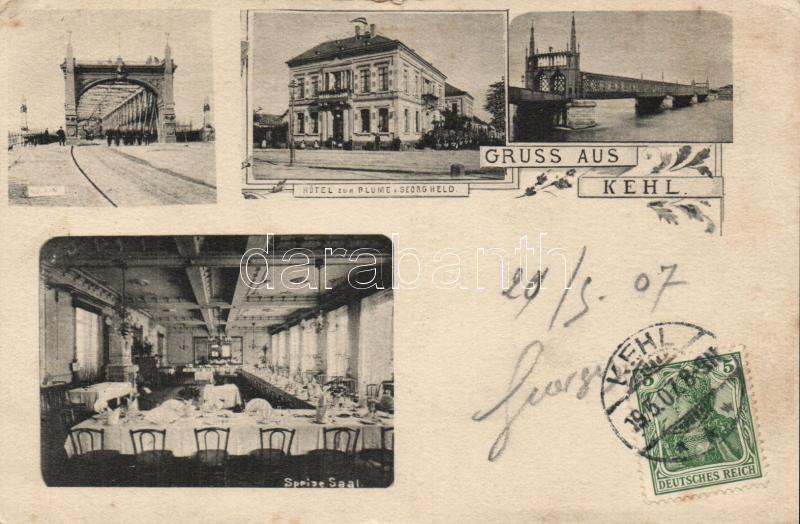 Beschreibung: Kehl, Hotel zur Blume v. Georg Held / hotel, bridge, dining room, interior, floral TCV card (kis szakadás / small tear)