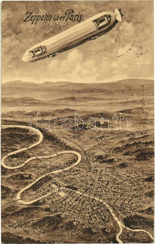 Zeppelin über Paris /Zeppelin airship above Paris https://www.darabanth.com/de/358-Fernauktion/358.0/Ansichtskarten/Fesselballons~1000073/Zeppelin-uber-Paris-Zeppelin-airship-above-Paris~II2057787