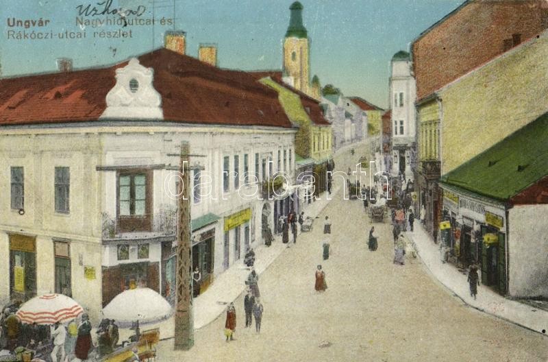 1920 Ungvár, Uzshorod, Uzhhorod, Uzhorod; Nagyhíd és Rákóczi utca, piac, bor és sörcsarnok, üzletek / streets, market, shops, beer and wine hall (EK)