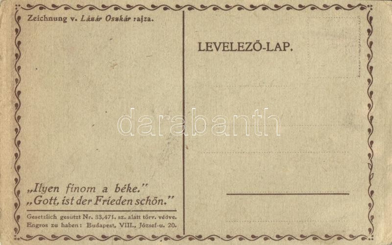 Beschreibung: 1918 Gott, ist der Frieden schön! / Ilyen finom a béke! / WWI Austro-Hungarian K.u.K. military, peace propaganda, art postcard s: Lázár Oszkár (kopott sarkak / worn corners)