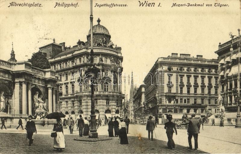 Beschreibung: 1909 Wien, Vienna, Bécs I. Albrechtsplatz, Philipphof, Tegetthoffstrasse, Mozart-Denkmal / square, beer hall, palace, Mozart monument (EK)