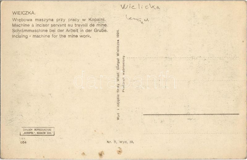 Wieliczka, Wrebowa maszyna przy pracy w Kopalni / salt mine, Incising ... https://www.darabanth.com/de/358-Fernauktion/358.0/Ansichtskarten/Polen~1000036/Wieliczka-Wrebowa-maszyna-przy-pracy-w-Kopalni-salt-mine-Incising-machine-for-the-mine-work-fl~II1568835