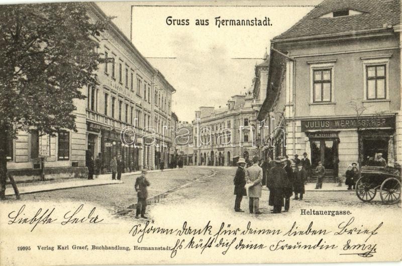 1901 Nagyszeben, Hermannstadt, Sibiu; Heltauergasse / Disznódi utca, Julius Wermescher és Carl Landmann üzlete, Transsylvania szálloda. Karl Graef kiadása / street view, shops, hotel