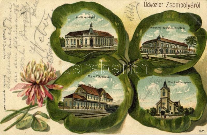 1908 Zsombolya, Hatzfeld, Jimbolia; Vasúti vendéglő, MÁV pályaudvar, vasútállomás, Római katolikus templom, Muschong palota M. kir. posta. Lóhere montázs dombornyomott litho, Perlstein F. kiadása / railway station and restaurant, post palace, church. Clover montage Emb. litho