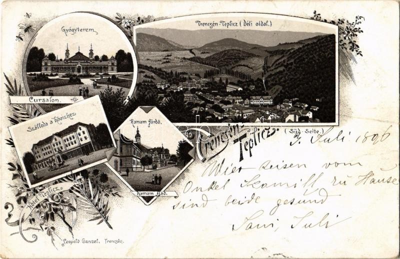 1896 (Vorläufer!!!) Trencsénteplic, Trencianske Teplice; Cursalon, Hotel Teplicz, Hamam Bad, Süd-Seite / Gyógyterem, Szálloda a Hővízhez, Hamam fürdő, déli oldal. Leopold Gansel kiadása / spa, bathing house, hotel. Art Nouveau, floral, litho (EK)